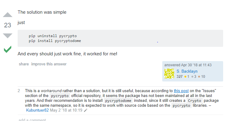 "Dependency for development" - Pycrypto remains unmaintained and buggy: use pycryptodome instead as suggested by pycrypto's offcial repository, please update the readme file for this repo! #797