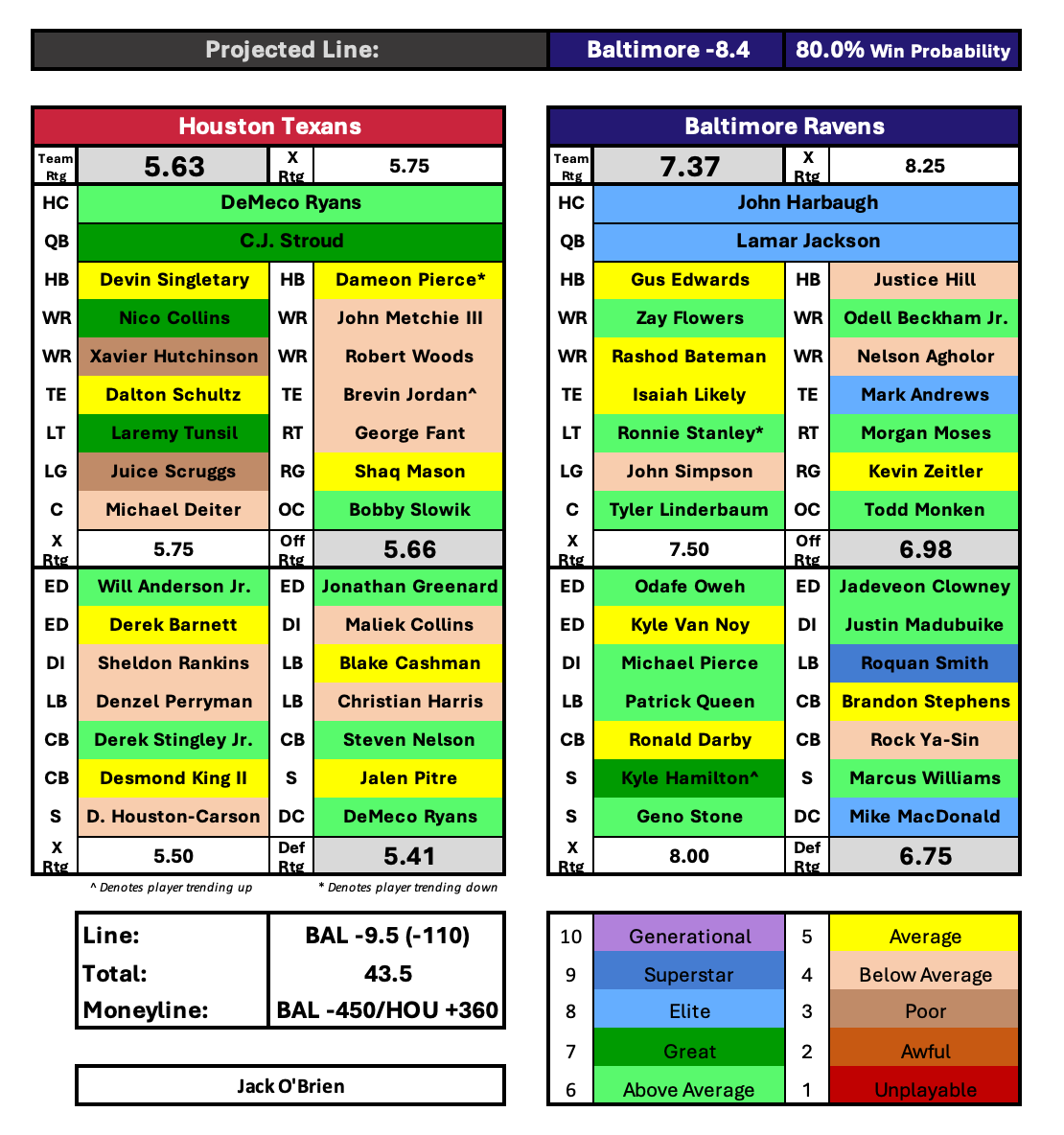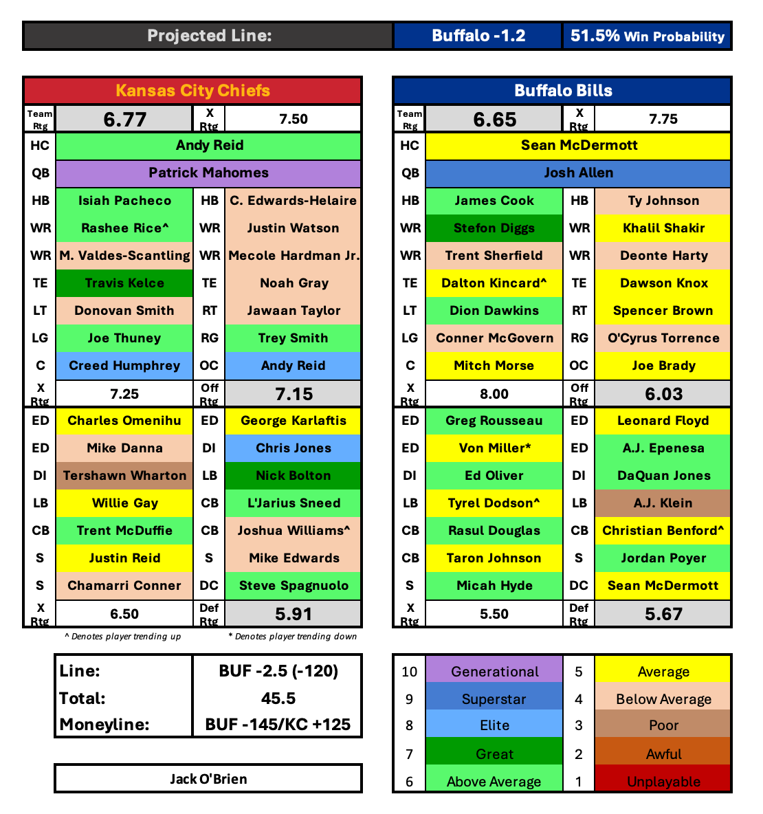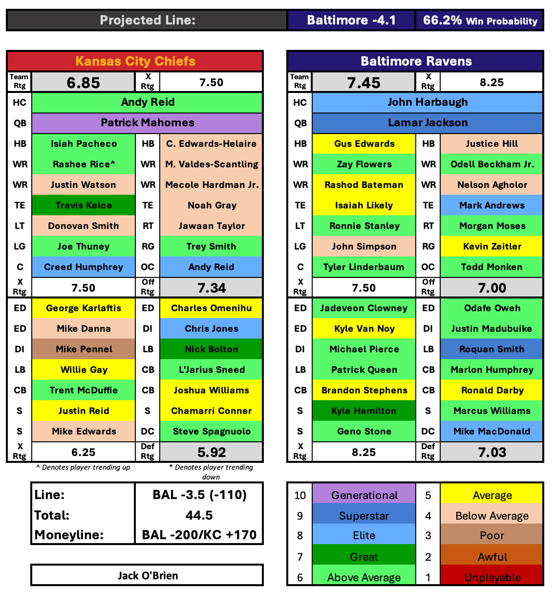 There are a few injuries to monitor in this game. It sounds like all good news on Baltimore’s side as they should be at full strength with Mark Andrews and Marlon Humphrey returning to the lineup, unless I’m missing something there. Joe Thuney is highly questionable for the Chiefs and would be a big loss against the strong interior defensive line the Ravens possess. I’d expect he grits through it and plays, but won’t be at peak performance. Isiah Pacheco is banged up but will play, and it sounds like Willie Gay will also be in the lineup despite battling a neck injury. The only other notable injury for KC is safety Mike Edwards who is dealing with a concussion. Even if he can’t go, rookie Chamarri Conner deserves to play over him anyway. Conner was outstanding last week with a 90.2 PFF grade.
