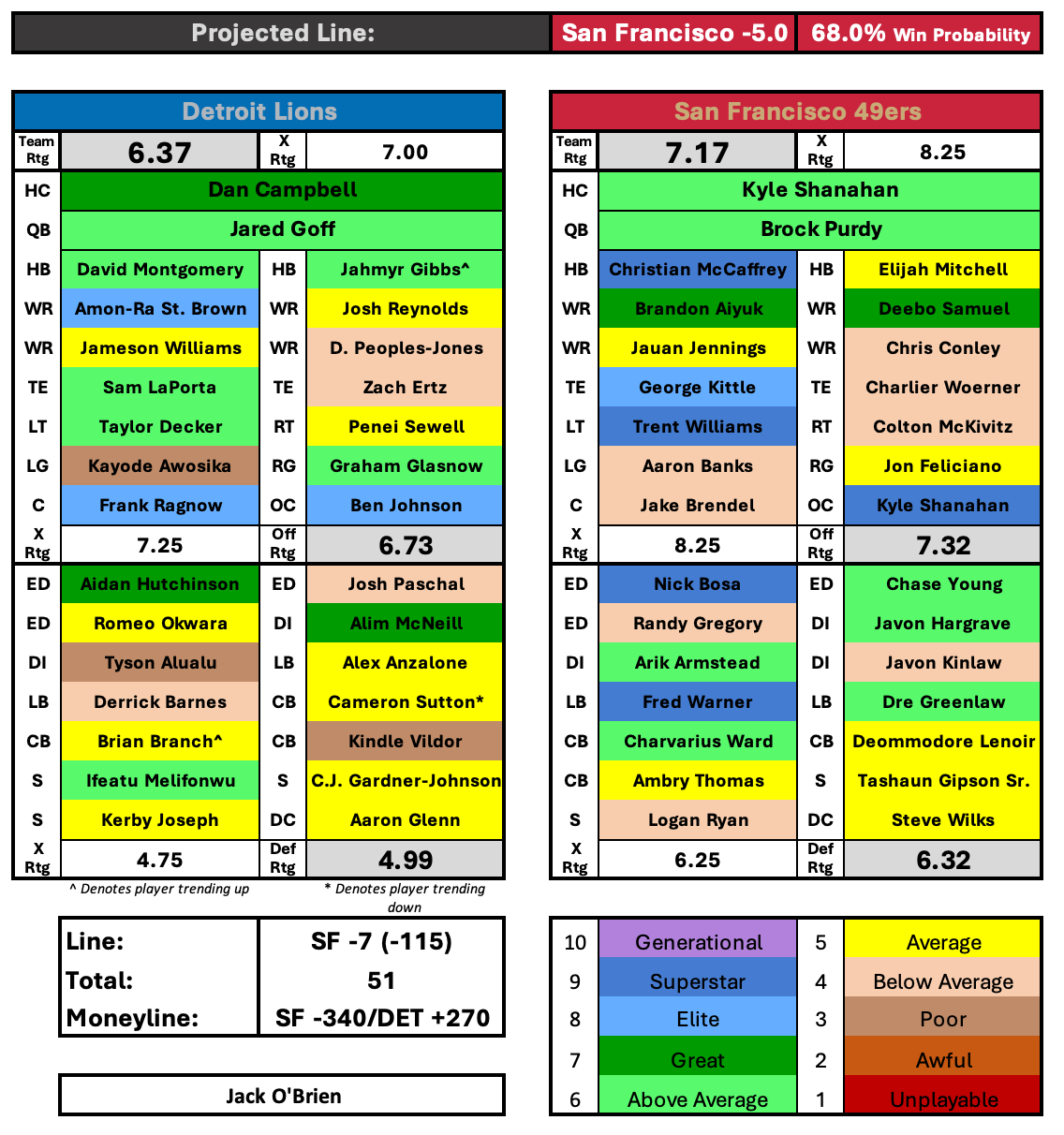 I think this game rests on the shoulders of Brock Purdy. The Lions defense has been good against the rush this season, although the 49ers running game is a different beast. If Detroit can slow down their rushing attack, it’s on Purdy to beat this very-beatable team through the air. If they are down Deebo that gets a bit tougher.