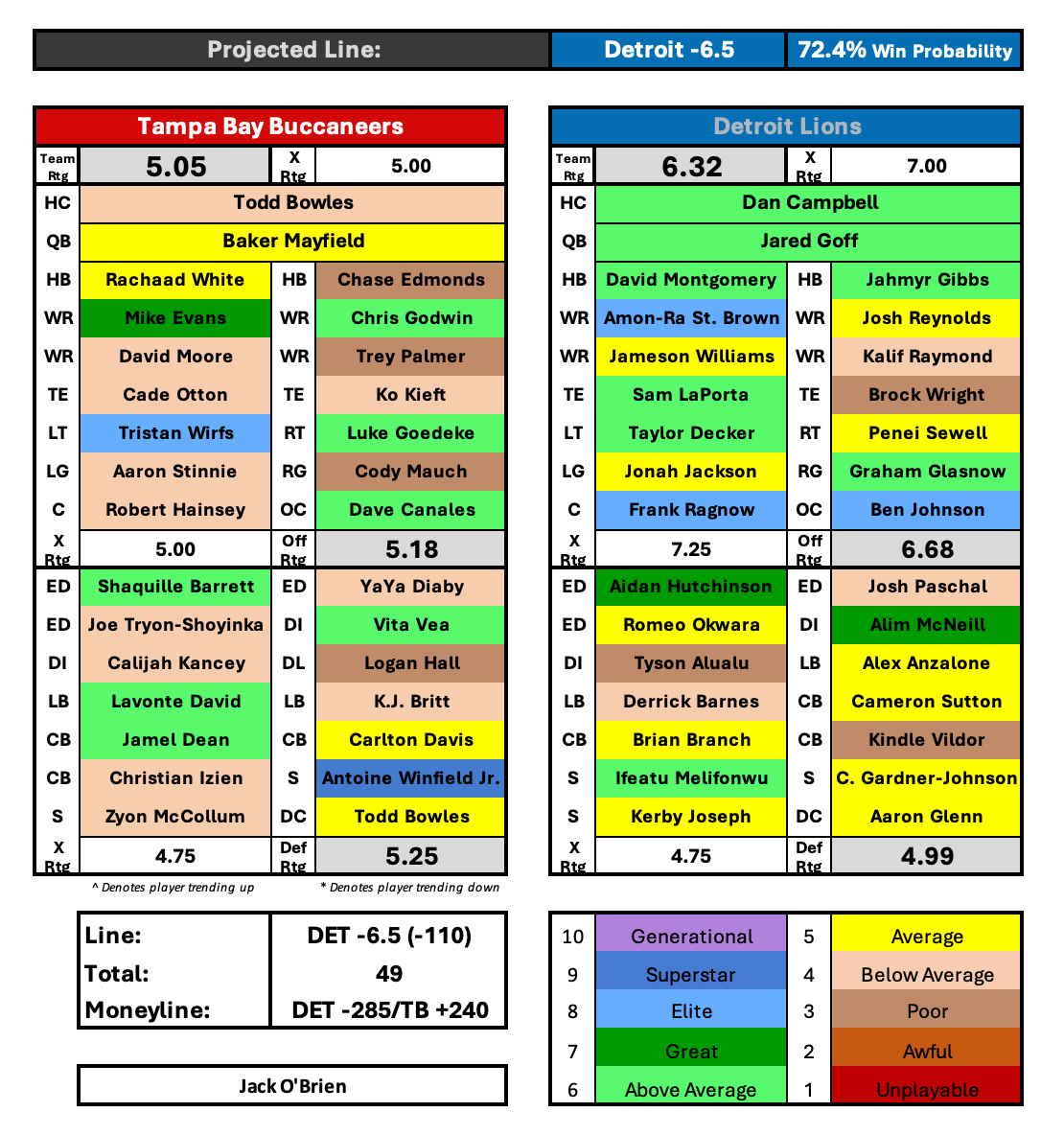 My numbers like the Lions in this game. I’m frightened to back Jared Goff on the road against this 49ers defense, but I don’t think they are as dominant as the units they’ve had the past few years. I’m also not sure why Logan Ryan is starting over Ji’Ayir Brown, although that’s pretty meaningless in handicapping this game. Both defenses appear to be fully healthy as the only notable injuries are on the offensive side of the ball. The Lions replaced TE2 Brock Wright with 33-year-old Zach Ertz. Wright wasn’t good so this shouldn’t have an impact as Ertz is also: not good. The big injury for the Lions is guard Jonah Jackson, who is a solid player. He was replaced by third-year UDFA Kayode Awosika who was awful in 46 snaps of relief last week. That will be a point of attack for Steve Wilks and the Niners defensive line.
