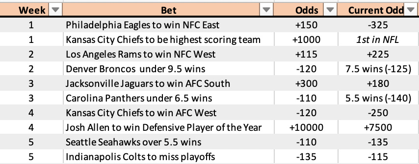 My biggest bet of the week was on Mahomes and the Chiefs. The two bets I wrote up were KC +3 and Mahomes over 1.5 passing touchdowns, but also had big wins on Chiefs moneyline and the over.
