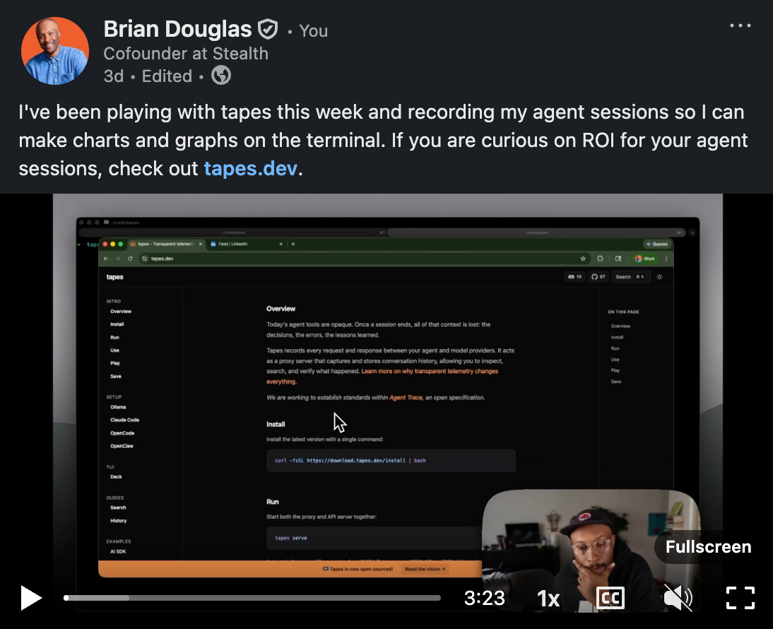 John and I are working a new project, Tapes (github.com/papercomputeco/tapes) - a telemetry system for agents to capture, search, and checkpoint agents sessions. If you’re interested in understanding what your agents are actually doing, or sharing context across your team with zero instrumentation, check it out. We’re at 100 stars and counting. We’d love your feedback.