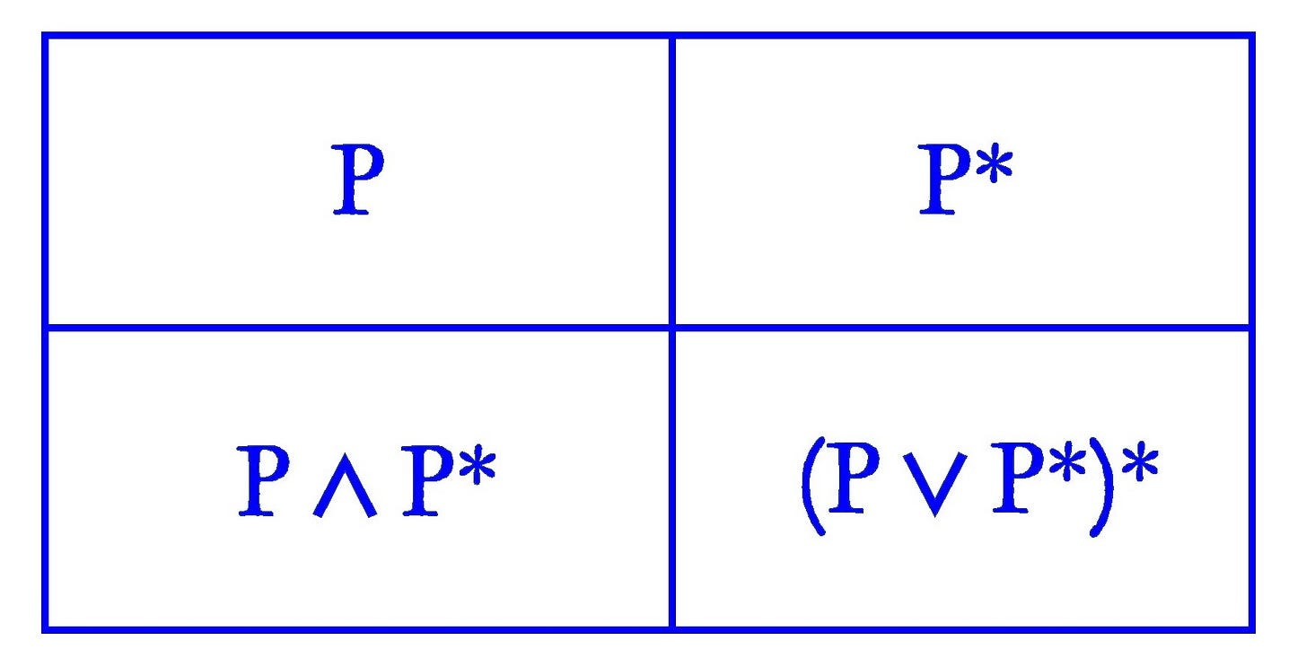 The tetralemma, known as the double or four-fold negation (hence “tetra-lemma” — four propositions), is a device of Buddhist logic or dialectics. Rather than representing a sacred figure, the tetralemma is more of philosophical prop, used for refusing bad questions rather than refuting specific claims. It has a scary reputation, but it’s largely undeserved. The gist of it is actually pretty straightforward. It basically says that when you’re asserting or questioning a certain Something, you have four general options to contend with: first, you have that Something, or alternatively you can have Something Else, or a mix of that Something and Something Else, or neither that Something nor Something Else. If none of those four options bears out or makes sense, then that means that there’s probably something screwy about your original assertion or question. Is my new jacket blue or red? The answer may be that my new jacket is blue, or maybe red, or maybe some mix of the two, like purple, or maybe neither red nor blue, like yellow. This is easy enough because the question makes sense. However, if I didn’t buy a new jacket or if I didn’t have a jacket at all, then it’d make no sense to squabble over what color it is. It’s just a screwy question, so none of the four options hold. Nagarjuna ran with this, turning it into his signature philosophical method. By demonstrating that none of the four options held for a given question, he’d go on to prove to his readers or audience that it was hopelessly screwy. I think the custom of expressing this in Western formal logic is misleading (for reasons I won’t go into here), but if it helps you visualize the four folds or quadrants, this is what that looks like (where P is the assertion of that Something and asterisk means Else):