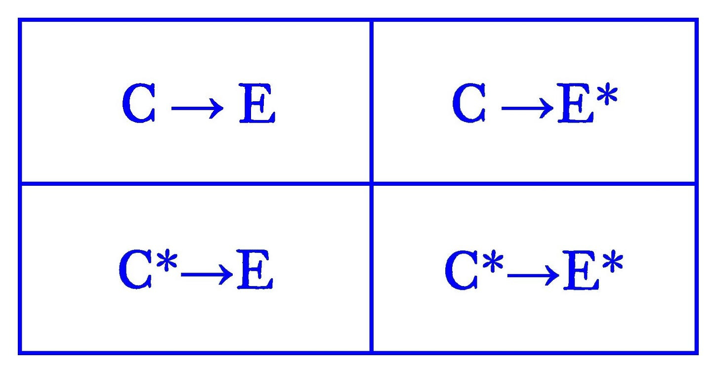 Notice how this story unfolds like a tetralemma, each step corresponding to a greater understanding, from clueless driver, to world-wise uncle, to talented mechanic, to the god-tier bricolage of Emile Leray. Only in this tetralemma, we started with becoming rather than being, with a mere process or kinesis, that of a working automobile. Initially, the only way we understand the car’s processes is either (from the passenger side) as a given flow or (from the driver side) through the slavish repetition of the same steps in the same order, by rote procedure or rule. This is a pretty shit understanding in any domain, I think we can all agree, whether it’s baking a cake, solving a math problem, writing an essay, song, or screenplay, playing chess, or devising the political or economic system of an entire society. Its story welds causes to effects, whether by habit or necessitation. Our understanding deepens as we consider all the permutations of Something and Something Else, that is, through all the ways that cause might fold into possibility (rather than folds of “negation,” as others have characterized it). This is the shift from thinking about process to thinking about power. In the first panel is a relation of causes and effects. In the second, the possibility of other effects. In the third, the possibility of other causes. And in the fourth and final, the possibility of other causes and other effects. Here’s a mock-up of this in the form of a tetralemma:
