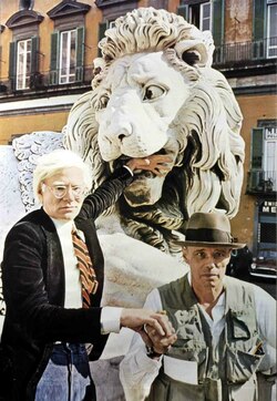 Im Mai 1979 traf er in der Galerie Denise René/Hans Mayer in Düsseldorf zum ersten Mal Andy Warhol, der dort gerade eine Ausstellung seiner neuen Bilder zeigte. Bei diesem Treffen fertigte Warhol ein Polaroid von Beuys an, das die Vorlage für mehrere mit Diamantstaub (Diamond-Dust) bearbeitete Serigraphien wurde. Beide Künstler, die vom Kunstmarkt als zwei konträre Stars betrachtet wurden, begegneten sich am 7. November 1979 anlässlich der Eröffnung der Ausstellung Kunst = Kapital – Joseph Beuys, Robert Rauschenberg, Andy Warhol, zu der die Zeitschrift Capital eingeladen hatte, erneut in der Galerie Hans Mayer.[63] Vom 2. November 1979 bis 2. Januar 1980 widmete ihm das New Yorker Guggenheim-Museum als erstem Deutschen eine umfangreiche Retrospektive, Beuys war zu der Zeit 58 Jahre alt.[64]