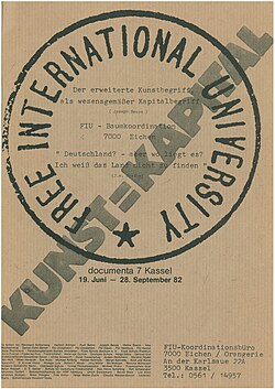 [Bearbeiten | Quelltext bearbeiten]Die documenta 5 von 1972 wird als Zäsur in Beuys’ Werk angesehen; während der 100 Tage der Ausstellung hatte er sich der Diskussion mit dem Publikum zur Verfügung gestellt. Im Folgenden entwickelte er einen erweiterten Kunstbegriff, mit dem er seine Vorstellung einer „umfassenden schöpferischen Umgestaltung des Lebens“[90] umriss und in dem Begriff der Sozialen Skulptur zu erfassen suchte. „Eine Gesellschaftsordnung wie eine Plastik formen, das ist meine und die Aufgabe der Kunst.“[91] Der Kern dieser Idee bestand in der Vorstellung, dass der „Mensch“ zu ändern sei mit den Mitteln der „Kunst“, womit er eine Gegenposition zu den in den 1960er Jahren entworfenen Mitteln des „Klassenkampfes“ bezog. Die eigene Person ist sozusagen der Werkstoff und der Mensch habe die Aufgabe, diesen Stoff eigenverantwortlich wie eine Plastik als Kunstwerk zu formen. Zugleich repräsentiert die Soziale Plastik damit auch den erweiterten Kunstbegriff von Beuys.[92]
