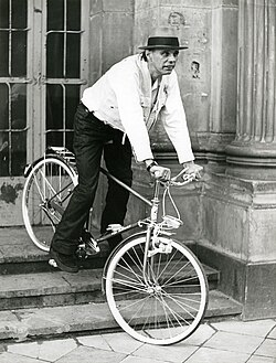 [Bearbeiten | Quelltext bearbeiten]Viele Kunstaktionen von Joseph Beuys wurden von Fotografen, wie zum Beispiel Gianfranco Gorgoni, Bernd Jansen, Ute Klophaus oder Lothar Wolleh, im Bild festgehalten. Beuys verwendete diese Fotografien teilweise als positive sowie als negative Reproduktionen für seine Multiples. In späteren Fluxusaktionen setzte Beuys tonale und atonale Kompositionen und Geräuschcollagen ein, wobei er Mikrophone, Tonbandgeräte, Rückkopplungen, verschiedenen Musikinstrumente und seine eigenen Stimme einbrachte. Er arbeitete dabei zusammen mit anderen Künstlern, zum Beispiel mit Henning Christiansen, Nam June Paik, Charlotte Moorman und Wolf Vostell. Besonders schätzte er den US-amerikanischen Komponisten und Künstler John Cage.[89] Es entstanden Werke wie Eurasia und 34. Satz der Sibirischen Synphonie mit dem Einleitungsmotiv der Kreuzesteilung, 1966. In der Aktion …oder sollen wir es verändern, 1969, spielten er Klavier und Henning Christiansen Violine. Beuys schluckte Hustensaft, während Christiansen ein Tonband mit Geräuschcollagen aus Stimmen, Vogelgesang, Sirenengeheul und anderen elektronischen Klängen abspielte.