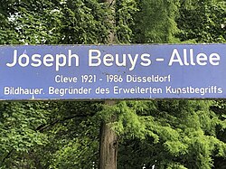 Beuys entwickelte – nicht zuletzt mit Bezug auf den tatsächlich in der Nähe auf die Welt gekommenen Anacharsis Cloots – die Legende, er sei in „Cleve“ geboren.[58] Die Stadt Kleve unterstützt diese Legendenbildung mit einer entsprechenden Behauptung auf einem Straßenschild der Joseph Beuys-Allee.
