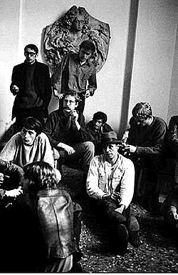 Joseph Beuys war beinahe täglich präsent in der Akademie, selbst samstags und in den Semesterferien. Ab 1966 veranstaltete er regelmäßig sogenannte Ringgespräche mit seinen Studenten, initiiert von Anatol Herzfeld, in denen in einem vierzehntäglichen Rhythmus Theorien entworfen und diskutiert wurden. Diese Gespräche waren öffentlich und fanden bis zu Beuys’ fristloser Kündigung (s. u.) durch seinen Arbeitgeber, das Wissenschaftsministerium, 1972 statt.[46] Die Hinwendung zur Theorie war anfangs unter den Studenten der ersten Generation durchaus umstritten. An den Ausstellungen der Studenten, den jährlichen Rundgängen zum Ende des Wintersemesters im Februar, nahm er teil.