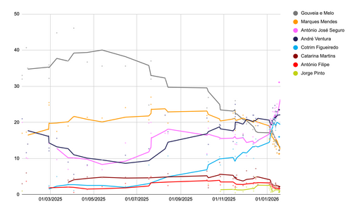| ICS/ISCTE | 5. – 13. Dezember 2025 | 903 | 20,0 % | 20,0 % | 14,0 % | 22,0 % | 10,0 % | 5,0 % | 3,0 % | 1,0 % | 5,0 % | |||||