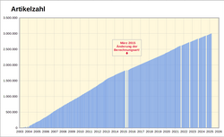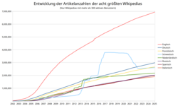 - ↑ Wikipedia-Statistik Deutsch. Archiviert vom am 3. März 2025; abgerufen am 4. August 2025.