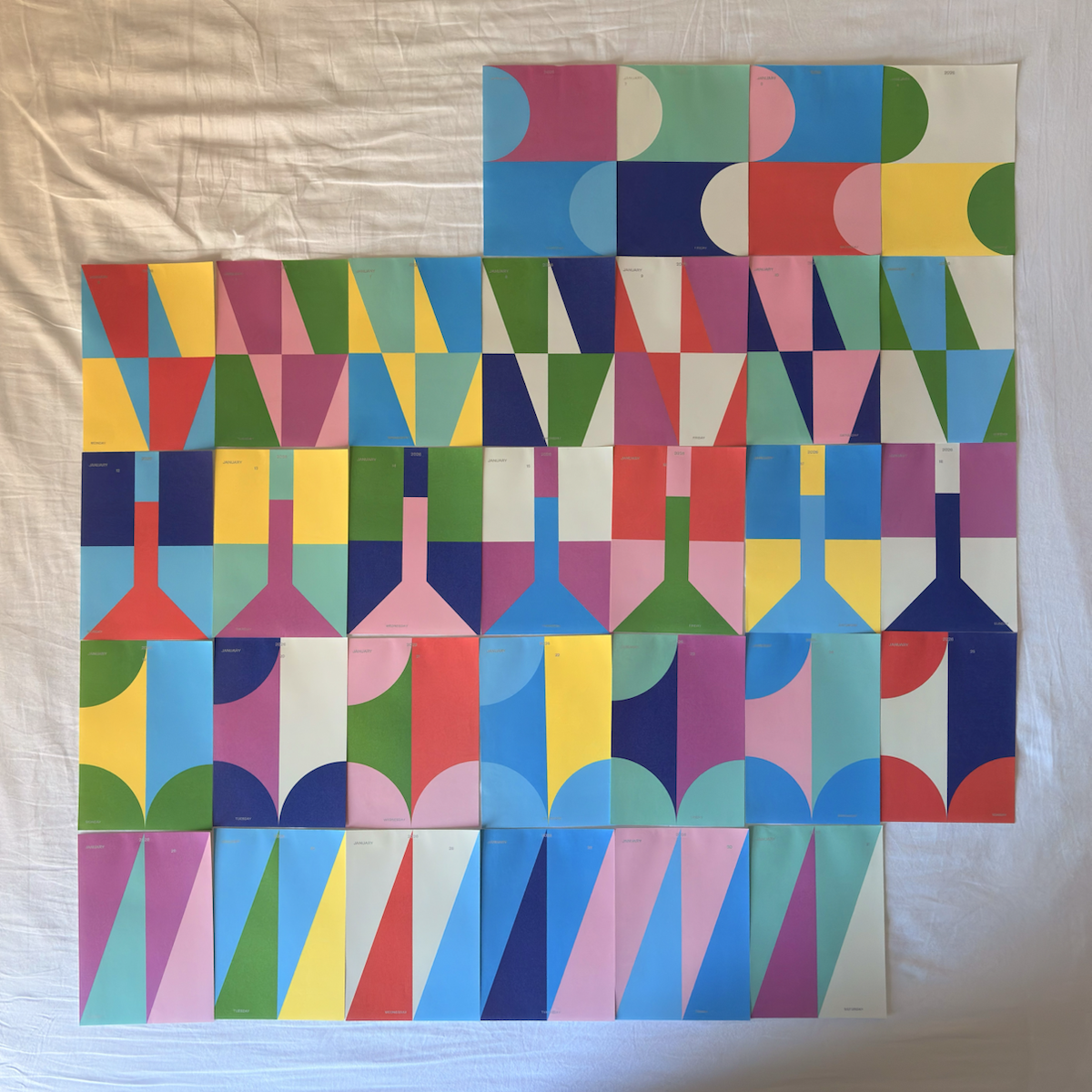 It’s kinda neat that this issue falls on the first of a month. For one thing, I get to tell you about the calendar that I’ve been enjoying this year. It’s a ‘sculptural calendar’ by French artist Damien Poulain, with each day’s page featuring a unique composition of simple geometric forms in block colours. Here’s today’s page, in situ, hanging from a clip on my bedroom wall.